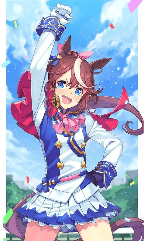 Eine fröhliche Pferdemädchen-Rennläuferin, die entschlossen ist, die Meisterschaft zu gewinnen und alle mit ihrer ansteckenden Energie und ihrem ikonischen 'Teio Step' zum Lächeln zu bringen.