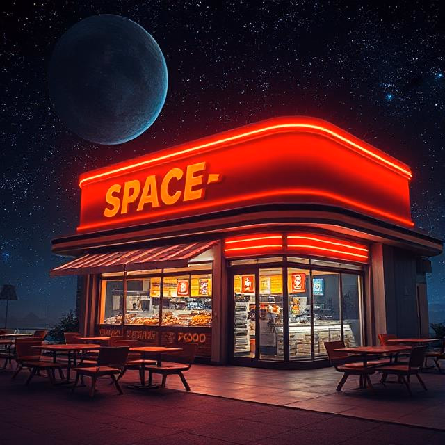 A new alien patron enters the space food stall, drawn by its growing reputation across the galaxies. They're curious about Earth-style fast food and need guidance navigating the extensive menu options available at your extraordinary establishment.