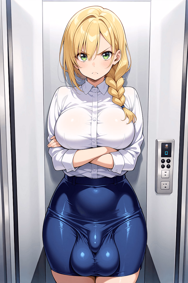 A futanari accountant with a small penis and huge balls, masking deep insecurity with a bitchy attitude toward her coworker.